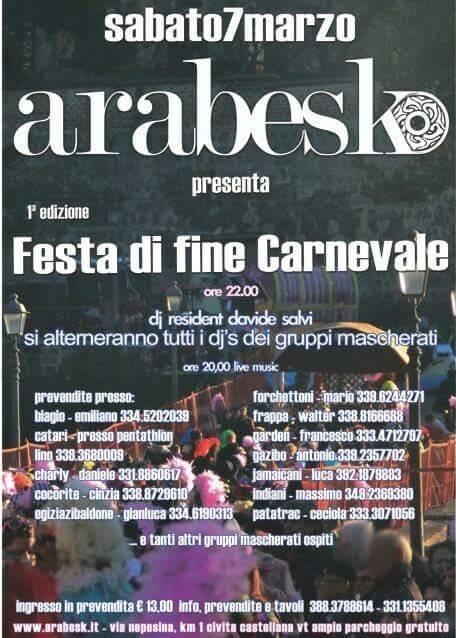 A Civita Castellana il Carnevale non è ancora finito. Per sabato 7 marzo la discoteca Arabesk promuove la prima edizione della festa di fine Carnevale.