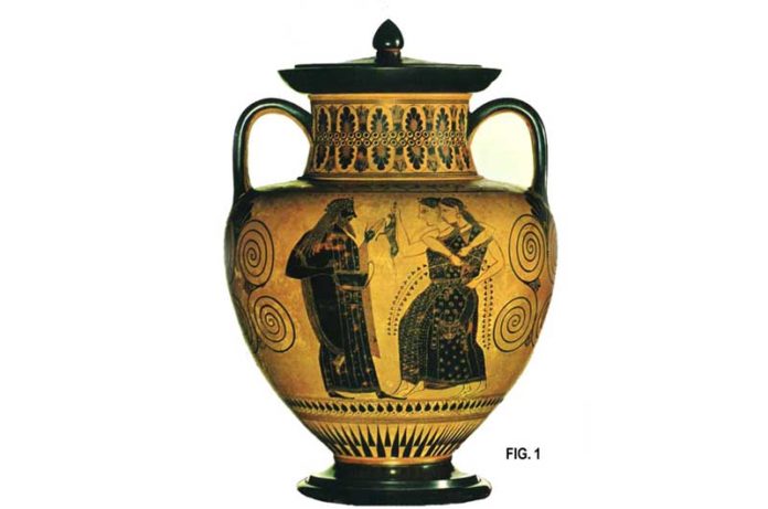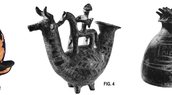 Le città costiere di Vulci (Velchi), Tarquinia (Tarkna) e Cerveteri (Chaisre), tutte edificate a qualche chilometro dal mare (così da poterne sfruttare i vantaggi evitandone al tempo stesso i pericoli) e tutte dotate di scali portuali frequentati da mercanti provenienti dall’intero bacino del Mediterraneo e non solo, proprio grazie alla loro posizione sono diventate le più grandi, ricche e potenti città/stato dell’antica Etruria, almeno nel periodo compreso tra l’VIII e il III secolo a.C. Tra queste, Vulci è quella che più di tutte ha tratto vantaggio dagli scambi commerciali con la Grecia e l’Oriente, dotata sia di un porto fluviale lungo il corso del Fiora sia di uno scalo marittimo, i cui resti sono stati individuati nella località di Regisvilla, presso la foce del fiume. Basti pensare che gran parte delle ceramiche greche rinvenute in Etruria (prodotte soprattutto dalle botteghe di Atene e di Corinto) sono state restituite proprio dalle necropoli di Vulci, tanto che per un lungo periodo si è pensato che si trattasse di ceramiche di produzione etrusca. Finché un grande archeologo tedesco, il Gehrard, in una sua memorabile pubblicazione intitolata “Rapporto vulcente”, non riuscì a dimostrare che si trattava in ogni caso di ceramiche importate dalla Grecia tra il VII e il V secolo a.C., prima a figure nere (fig. 1) e poi a figure rosse (fig. 2): un fiorente commercio che, però, già indebolito per la perdita del controllo etrusco delle rotte tirreniche a seguito della battaglia navale di Cuma combattuta e persa contro i Siracusani (474 a.C.), venne bruscamente interrotto alla fine del V secolo a.C. a causa della disfatta di Atene (principale partner politico e commerciale degli Etruschi) nella Guerra del Peloponneso.