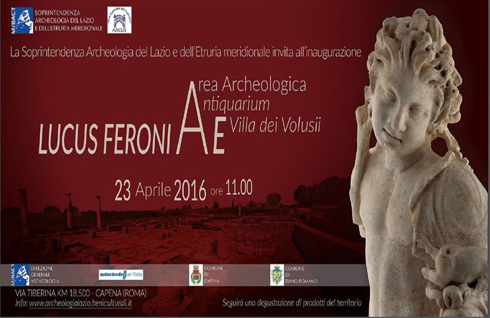 Si riaprono al pubblico, con aspetto rinnovato e in unico percorso di visita, la suggestiva area archeologica di VI-III secolo a.C. del santuario del Lucus Feroniae (bosco sacro dedicato a Feronia, dea italica della fertilità dei campi e propiziatrice dei commerci), la contigua colonia romana del I secolo a.C. (Iulia Felix Lucoferonensium), con l’annesso Antiquarium, nel comune di Capena, e la villa dei Volusii Saturnini, nel comune di Fiano Romano.Inaugurazione il 23 aprile alle ore 11,00 a Capena.