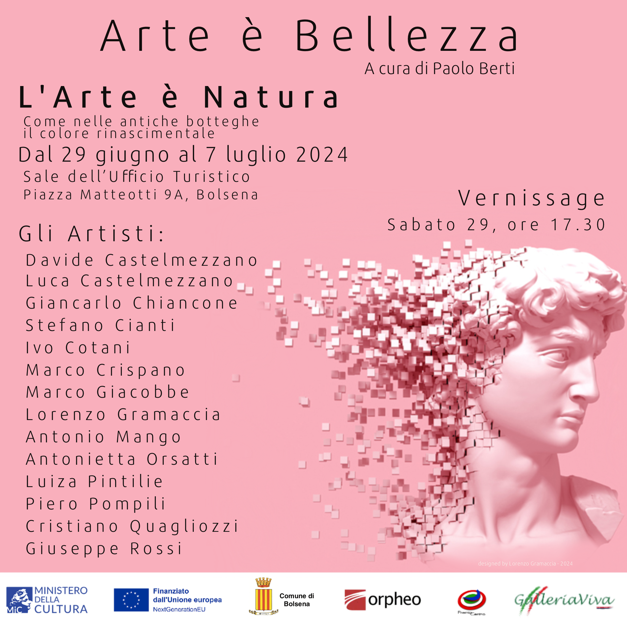Arte è bellezza – L’arte è natura– Come nelle antiche botteghe il colore rinascimentale. Palazzo dell’Ufficio Turistico , Piazza Matteotti 9/a Bolsena – dal 29 giugno 2024 al 7 luglio 2024– A cura di Paolo Berti