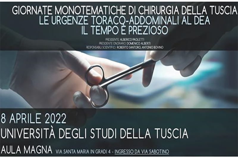 Venerdì 8 aprile, a partire dalle ore 9.00, presso l’aula magna dell’Università degli studi della Tuscia, si svolgerà la seconda giornata monotematica di chirurgia della Tuscia, dopo la prima che si è svolta lo scorso anno, dal titolo: Le urgenze toraco addominali al DEA, il tempo è prezioso.