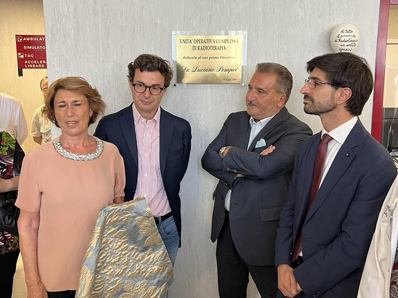In particolare al dottor Luciano Pompei, con l’apposizione di una targa commemorativa, è stato dedicato il reparto, essendo stato il fondatore e il primo direttore della Radioterapia. Una seconda targa in ricordo di Carlo Montella, coordinatore tecnico del reparto fin dall’inizio e per molti anni, è stata apposta presso la sala acceleratori.