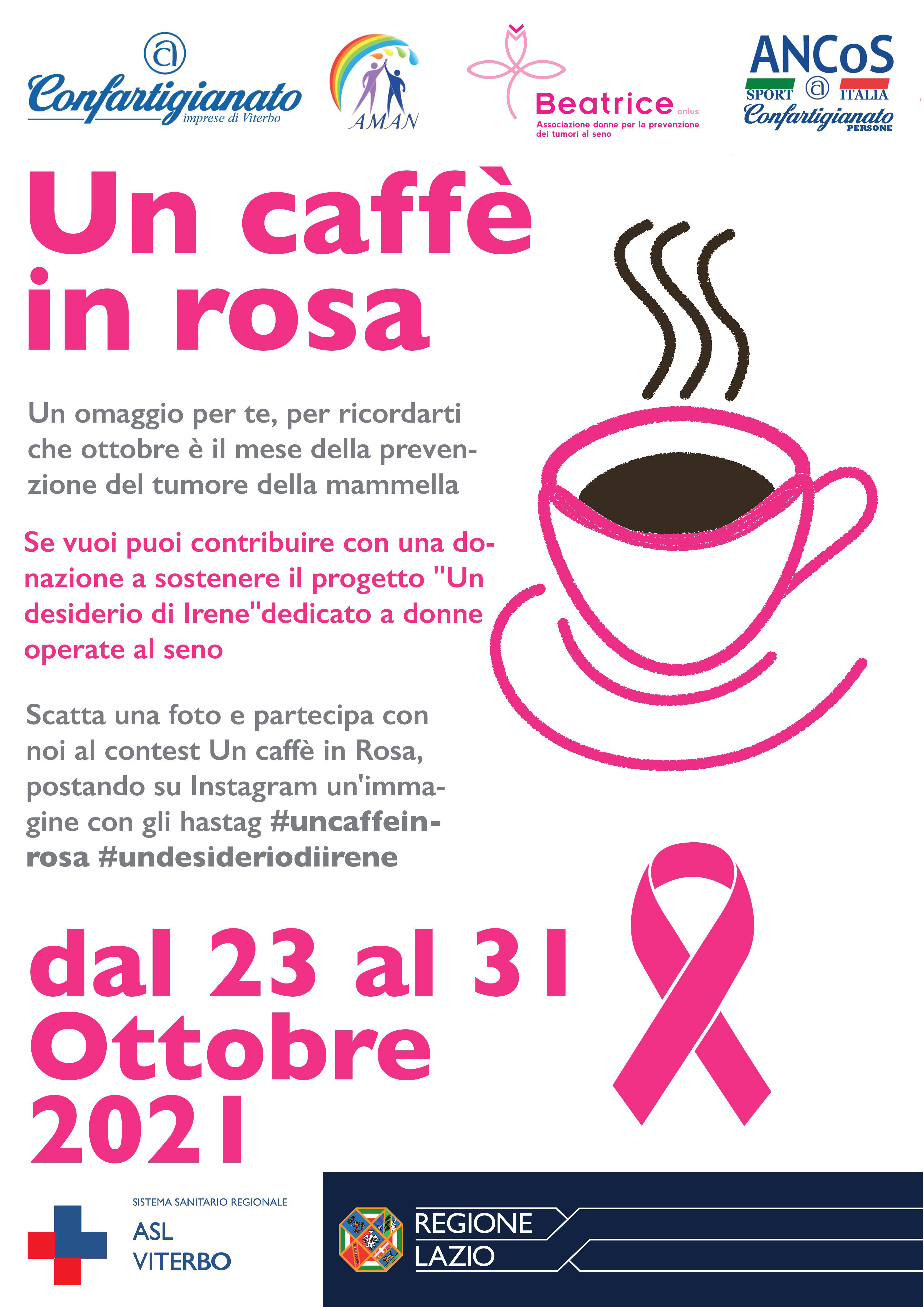 Nell’ambito di Ottobre rosa, il mese della prevenzione del tumore della mammella promosso dalla Regione Lazio, proprio 24 bar e pasticcerie della Tuscia saranno protagonisti di “Un caffè in rosa”, iniziativa promossa dal progetto Un desiderio di Irene e dalla Breast unit della Asl di Viterbo, coordinata dalla dottoressa Agnese Fabbri.