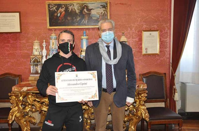 Attestato di merito sportivo ad Alessandro Ciprini. Lo scorso 3 dicembre, il sindaco Giovanni Maria Arena ha conferito un riconoscimento all’atleta viterbese per aver conquistato, gareggiando con la Nazionale Master, la medaglia d’argento alla finale dei campionati europei Master di Pesistica olimpica – Alkmaar, in Olanda, nel mese di ottobre. L’attestato di merito è stato consegnato nella sala Rossa di Palazzo dei Priori alla presenza dell’assessore allo sport Marco De Carolis e del consigliere comunale delegato ai rapporti con le società e le associazioni sportive Matteo Achilli.
