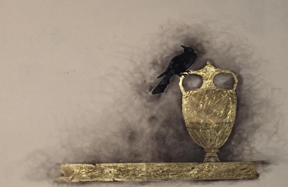 E’ così che la cupezza del carbone viene illuminata dai bagliori della foglia oro, che sottile ma preziosa s’inserisce nei quadri con il suo velo di regalità.