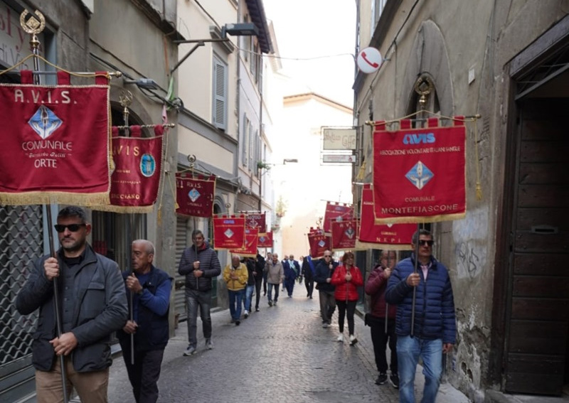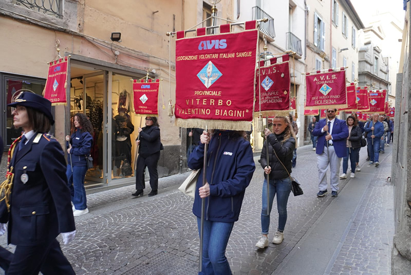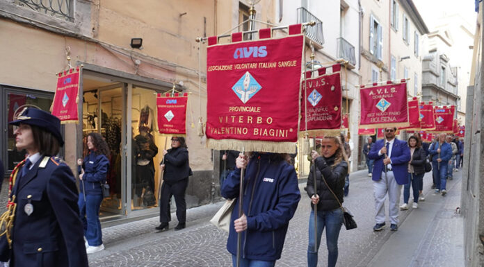 Questa mattina la Provincia di Viterbo, per il secondo anno consecutivo, ha concesso le civiche benemerenze alle donne e agli uomini donatori che hanno raggiunto il traguardo delle 50 donazioni.180 i premiati provenienti da 32 sezioni della Tuscia.Assieme a Romoli  il presidente dell’Avis Luigi Ottavio Mechelli, il vicepresidente Maurizio Todini e il vescovo Orazio Francesco Piazza. Una cerimonia davvero commovente che si è tenuta nel cortile di Palazzo Gentili ove era presente anche la sindaca di Viterbo Chiara Frontini.A precedere il corteo dei labari che da piazza dei Caduti ha attraversato via Marconi, corso Italia e via Saffi.
