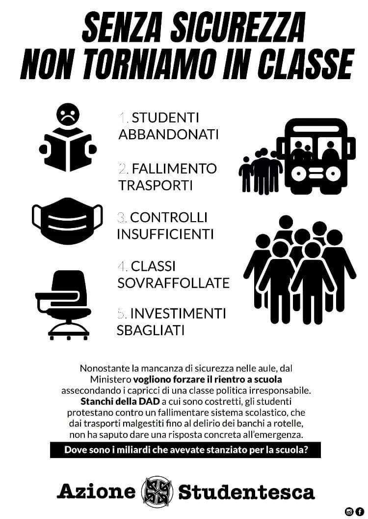 Dall’organizzazione dei trasporti fino ai controlli alle entrate, vogliamo istituti forniti degli strumenti idonei (termoscanner e tamponi rapidi in primis) per garantire una presenza certa e duratura per gli studenti.