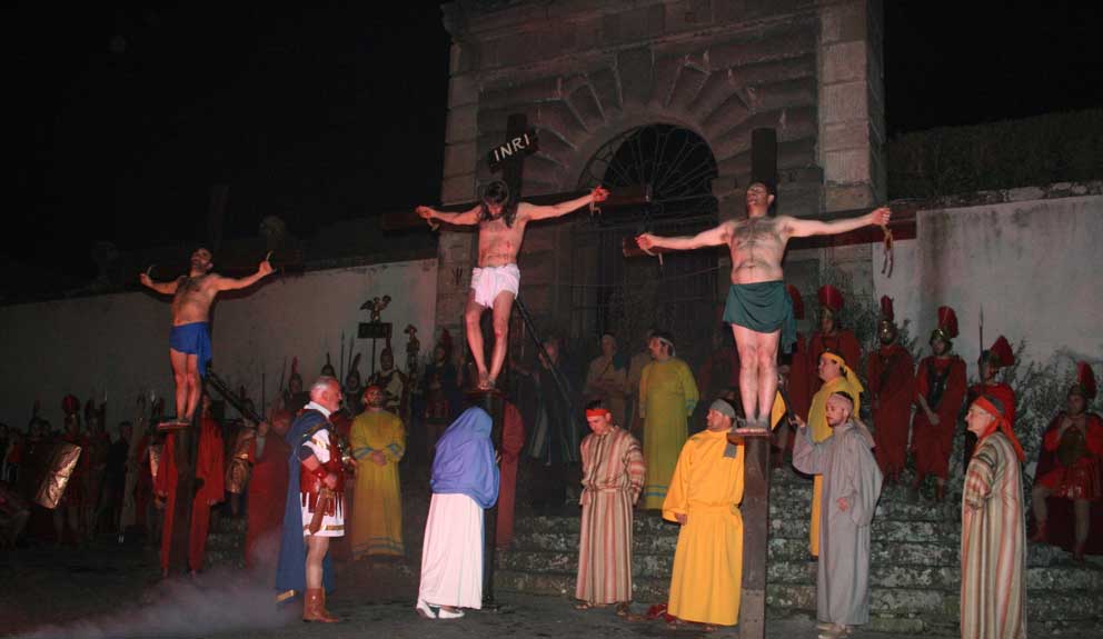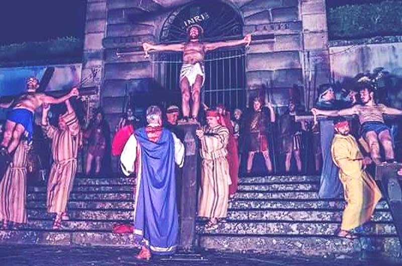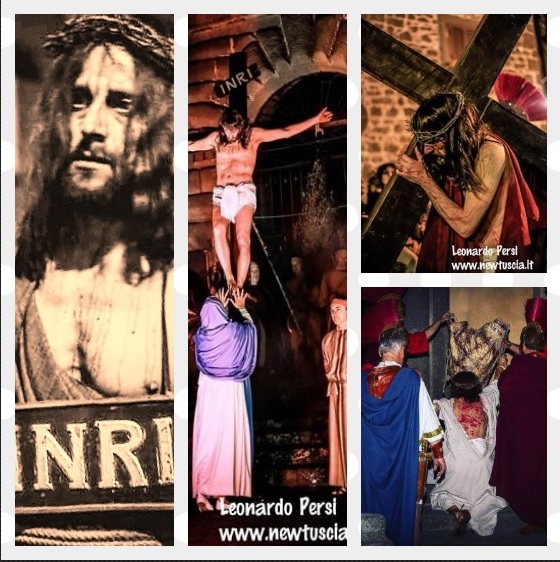 Oggi, grazie alla memoria lasciata dai fondatori, la Rievocazione della Passione di Cristo è imponente, spettacolare, sia per i costumi ricostruiti fedelmente su indicazione storica, sia per l’alto numero di figuranti (circa 400) che sfilano in sequenza per 18 quadri plastici che si snodano per le vie storiche del borgo di Bagnaia. Si parte dal Portale della Chiesa di San Giovanni Battista nella Piazza Centrale, mentre tutta la parata militare esce poco prima dal Portone Medievale del Borgo Antico. Tra il luccichio delle fiaccole disposte sulle fiancate della Chiesa, avanzano i figuranti, percorrono la parte esterna del Borgo per poi introdursi nel cuore del Borgo Antico, per riuscirne lentamente dal portale Cinquecentesco di Villa Lante, dove avviene la Crocefissione dal vivo. La parata militare si ricompone per rientrare nel Borgo Antico fino all’ex Chiesa di Santo Stefano. Contemporaneamente, nella zona della Crocefissione e subito dopo questa, si crea una seconda processione dal carattere strettamente religioso, formata dalla Bara del Cristo Morto portata a spalla da quattro figuranti, che percorrerà le stesse vie dove poco prima Gesù vi era passato sofferente sotto il peso della croce. Al suo seguito l’antica statua della Madonna Addolorata a sua volta scortata dalla popolazione. Terminato il percorso fanno ritorno nella Chiesa di San Giovanni Battista.