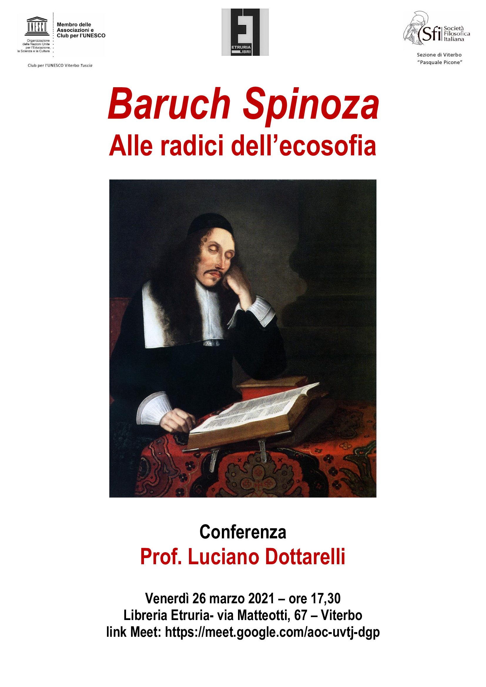 Nell’ambito della collaborazione tra la Società Filosofica Italiana – sezione “Pasquale Picone” di Viterbo e il Club per l’UNESCO Viterbo Tuscia, venerdì 26 marzo alle ore 17,30 si terrà la conferenza del prof. Luciano Dottarelli sul tema “Baruch Spinoza. Alle radici dell’ecosofia”.