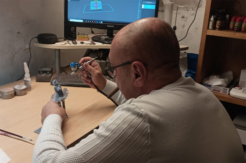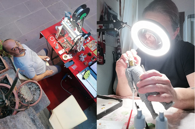 Benedetto Pinna e Azzurra Signorini nella vita sono marito e moglie, dalle loro terre di origine, rispettivamente la Sardegna in provincia di Cagliari e la Toscana, in provincia di Pisa, hanno scelto Vitorchiano, creando lì il loro laboratorio: Family Arts 3D, incentrato sulla produzione di statuette raffiguranti i personaggi più famosi del mondo dell’intrattenimento, del cinema e del fumetto, ma anche tutto ciò che gira nella dimensione del modellismo e delle action figure. Si occupano della fase della modellazione del personaggio: dalla stesura dei contorni di base all’animazione e al rendering e tutto ciò che sta in mezzo. Un’impresa di famiglia in cui i ruoli sono ben divisi: Benedetto realizza il modello e Azzurra lo dipinge. Per scoprire il loro mondo basta entrare nella loro fucina, un piccolo ambiente addolcito dai suoni e dai colori di questo borgo sospeso, dove “giù pe’ giù dentro” come viene chiamato dai vitorchianesi ne rappresenta ancora l’anima pura. Qui vive una piccola comunità, buona parte della quale come Benedetto e Azzurra hanno scelto di stare, ritrovandovi lo scandire del tempo, il saluto degli abitanti che incontri, la vita che pulsa e rende limpide le idee. Dando libero sfogo alla propria creatività. Li trovi in seduta stante nel loro laboratorio e anche quando le parole di ognuno fanno scorrere il loro racconto di vita, non si fermano, continuano a dare forma ai loro personaggi.