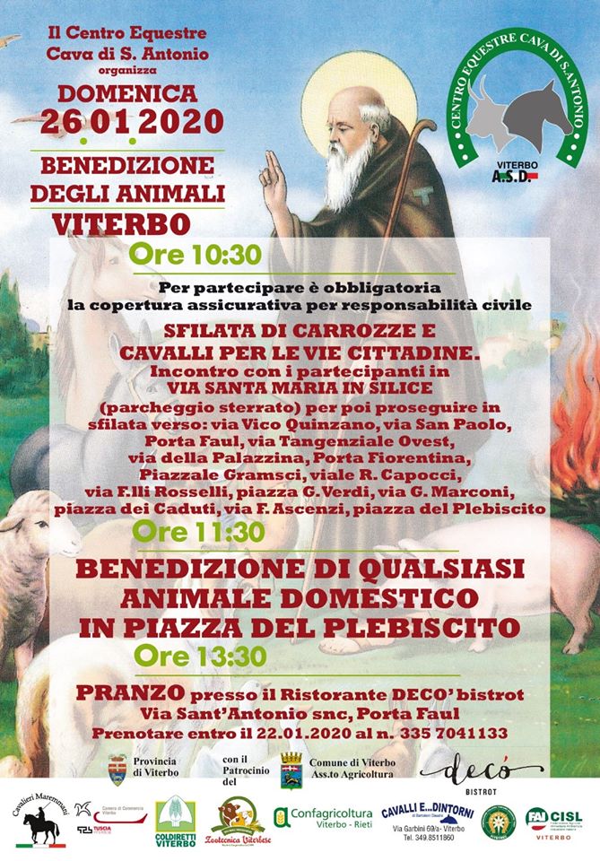 Il Centro Equestre Cava di Sant’Antonio organizza Domenica 26 gennaio 2020 la consueta Benedizione degli Animali a Viterbo alle ore 10.30 con sfilata di carrozze e cavalli per le vie cittadine.