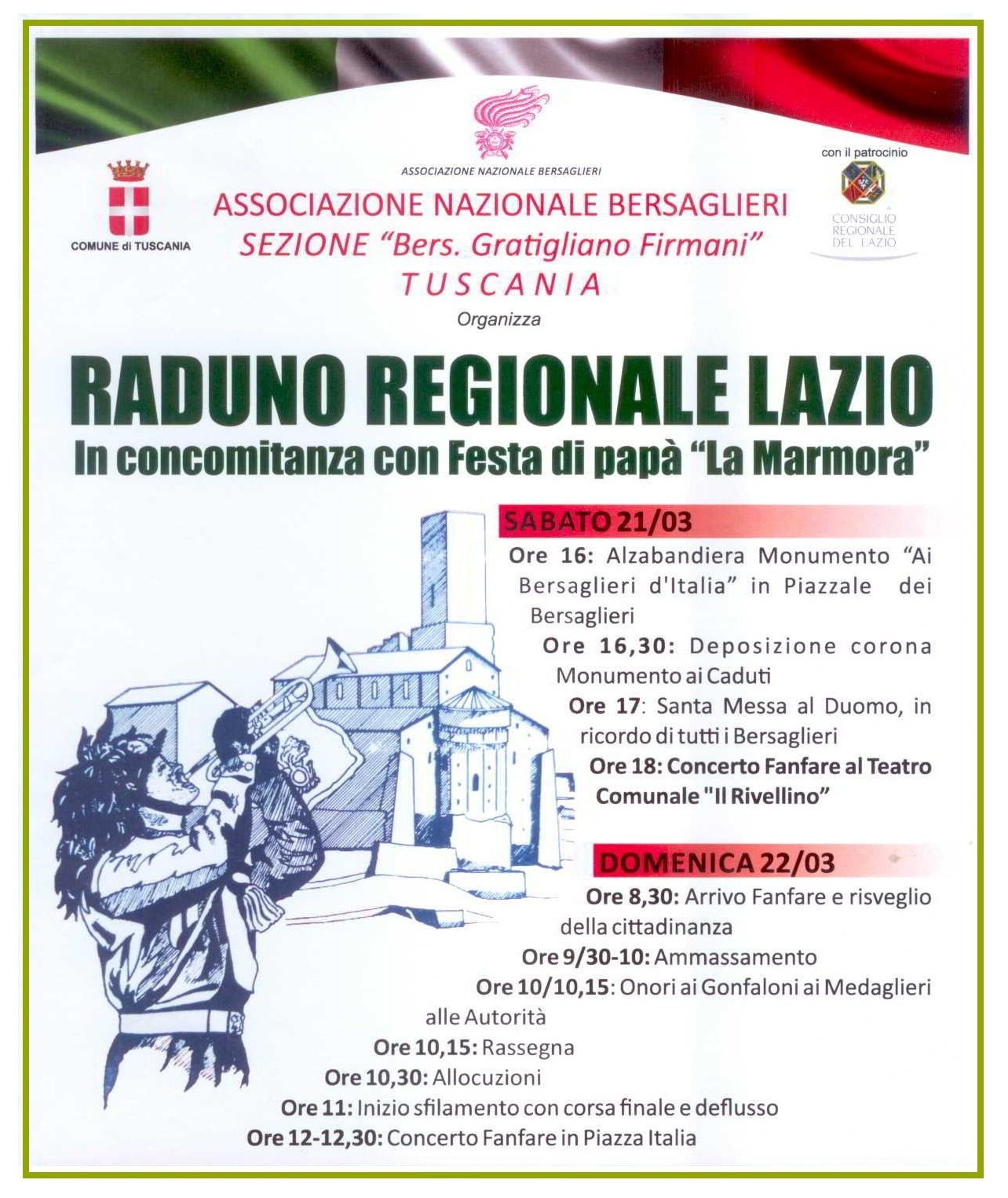 Sabato 21 e domenica 22 marzo 2015, Tuscania si prepara ad accogliere un grande evento a livello regionale, infatti, la splendida cittadina ospiterà il Raduno regionale dei Bersaglieri del Lazio.L’evento, in concomitanza con la “Festa del Papà”, dedicata a tutti i papà bersaglieri e a “Papà Sandrin”, come veniva affettuosamente chiamato dai suoi Bersaglieri Alessandro La Marmora, prevede un fitto calendario di iniziative, al fine di celebrare al meglio la prestigiosa manifestazione, per la quale viene designato, ogni anno, un unico paese ospitante.Il raduno prenderà il via sabato 21 marzo, alle 16, con l’alzabandiera al monumento dei Bersaglieri d’Italia e con la deposizione di una corona al monumento dei caduti.Seguirà, alle 16,30, la santa Messa al Duomo in ricordo di tutti i bersaglieri e, alle 18, il concerto della Fanfara al teatro comunale “Il Rivellino”.Domenica 22 marzo alle 8,30 ci sarà l’arrivo delle fanfare ed il risveglio della cittadinanza, seguiranno l’ammassamento, gli Onori ai Gonfaloni, ai Medaglieri e alle autorità, la rassegna e le allocuzioni. Dalle 11 inizierà lo sfilamento con la corsa finale e, a concludere, il grande concerto delle Fanfare in piazza Italia.Il raduno regionale dei bersaglieri è organizzato dalla locale sezione “Bers. Gratigliano Firmani” fondata nel 1977, attualmente presieduta da Umberto Subrizi e particolarmente attiva nell’organizzazione di grandi appuntamenti, anche a livello nazionale. Particolarmente atteso, quindi, è l’evento del 21 e 22 marzo, per il quale sono attesi a Tuscania centinaia di visitatori che potranno, contestualmente, apprezzare le bellezze della ridente cittadina.