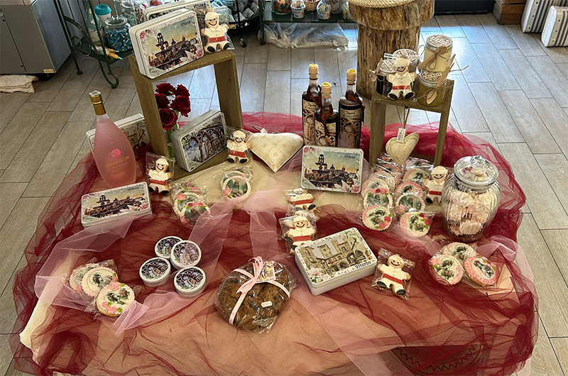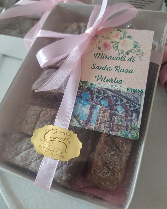 Vetrine di forni e pasticcerie in questi giorni sono addobbati a festa per celebrare Santa Rosa. Non mancano i Facchini realizzati in pasta di mandorle, buoni e anche belli da vedere, dedicati ai cavalieri della piccola Santa, oppure i miracoli di Santa Rosa, che sono biscotti molto gustosi a base di miele e nocciole. Alla pasticceria Casantini, nei punti vendita di via Monte Bianco, via Cairoli (qui la sera del 3 dopo il Trasporto ci saranno anche anche ciambelle e cornetti caldi), La quercia e via del Campo scolastico, sono disponibili anche in confezione regalo. “Abbiamo pensato a delle piccole box di metallo, di diverse dimensioni, con sopra le immagini delle bellezze Viterbo – spiega Katia Casantini – in modo che il cliente possa anche acquistarlo come idea regalo. Per i turisti si unisce l’utile al dilettevole perché i dolci della festa diventano così anche souvenir dalla nostra città”. Tutta la produzione classica della festa è, poi, disponibile presso la pasticceria Lombardelli a piazzale Gramsci. “Facchini, biscotti, pane di Santa Rosa con nocciole, miele, mandorle, noci, uvetta e fichi – spiegano da Lombardelli -, ma anche comode e gustose di ciambelline di Santa Rosa all’anice, da acquistare per sé o da regalare”.