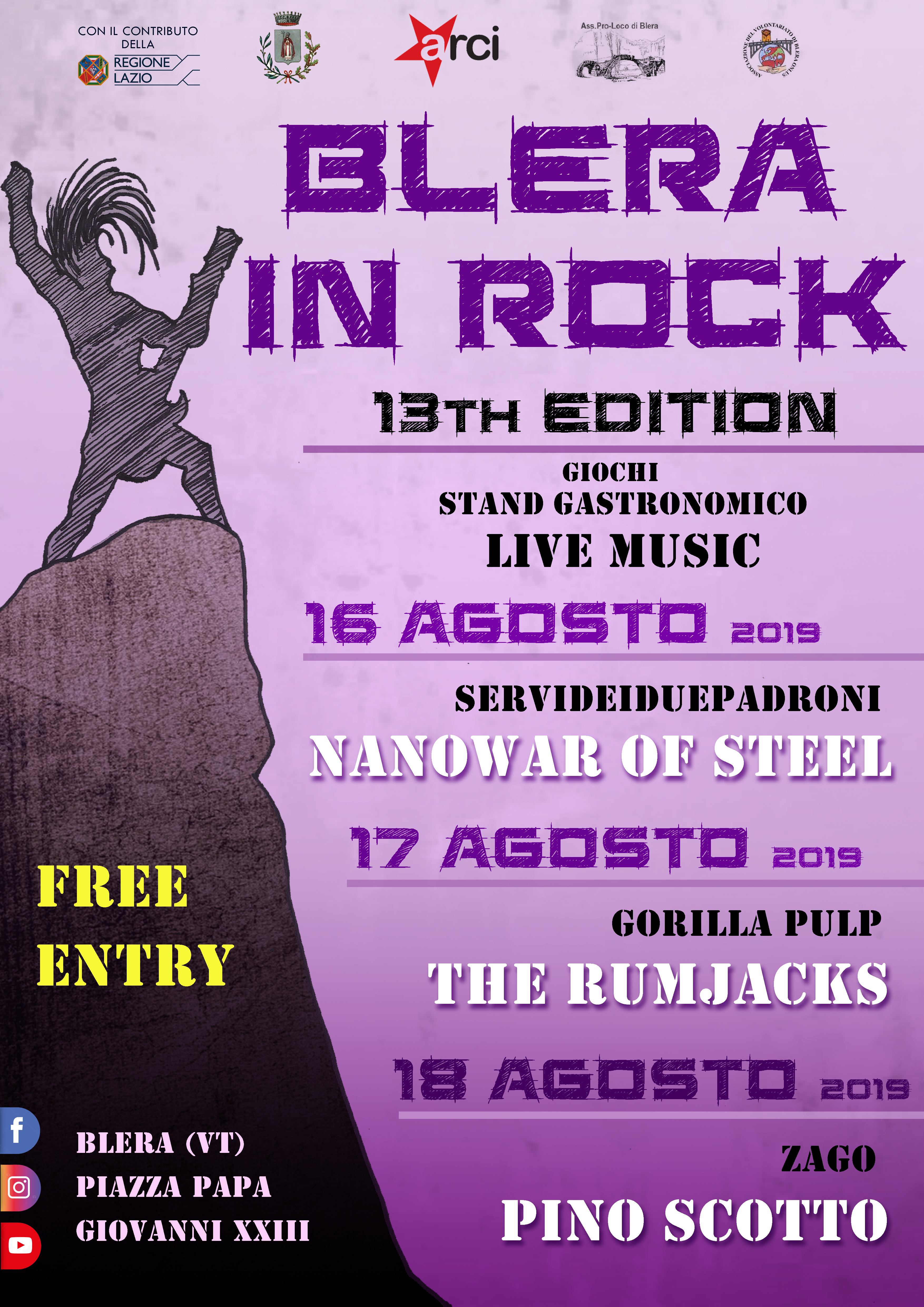 Si conclude domenica 18 agosto con Pino Scotto, uno dei padri della scena rock italiana, già frontman dei Vanadium, dei Fire Trails e dei Pulsar, un personaggio che da anni e anni porta avanti l’intero movimento. Vanta decine di pubblicazioni, collaborazioni con artisti di altissimo livello e migliaia di date in giro per l’Italia e l’Europa. In apertura ci saranno gli Zago, band underground di grande spessore artistico con delle sonorità che ricordano il miglior grunge.