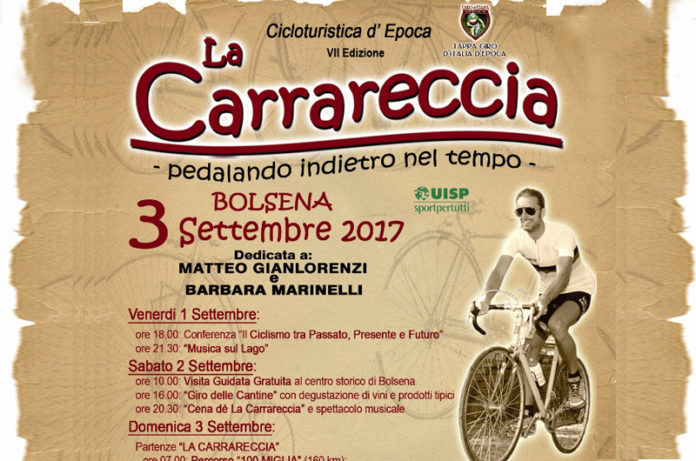 A Bolsena dal 1 al 3 settembresi svolgerà la settima edizione de LA CARRARECCIA – pedalando indietro nel tempo, la divertentissima e coinvolgente Cicloturistica d’Epoca perfettamente organizzata da Gianfranco Nucci e il Trombadores Team.