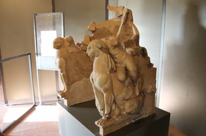 Trono in terracotta è conosciuto come il “Trono delle Pantere”, ritrovato tra i resti della Casa delle Pitture di Volsinii, area archeologica di Poggio Moscini a Bolsena. Il trono era stato frantumato in molti frammenti, ritrovati in uno strato di incendio.