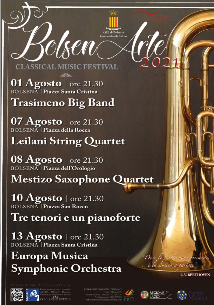 “Sono cinque appuntamenti che, nell’arco di 2 settimane, condurranno gli spettatori in un affascinante viaggio nel mondo della musica, spaziando dal jazz al blues, dallo swing ai classici come Mozart e Beethoven – conclude l’assessore alla cultura Raffaella Bruti –. Il programma è vario e di alto livello e, siamo certi, soddisferà le aspettative del pubblico, che avrà anche modo di conoscere e apprezzare le piazze più suggestive del centro storico di Bolsena”.