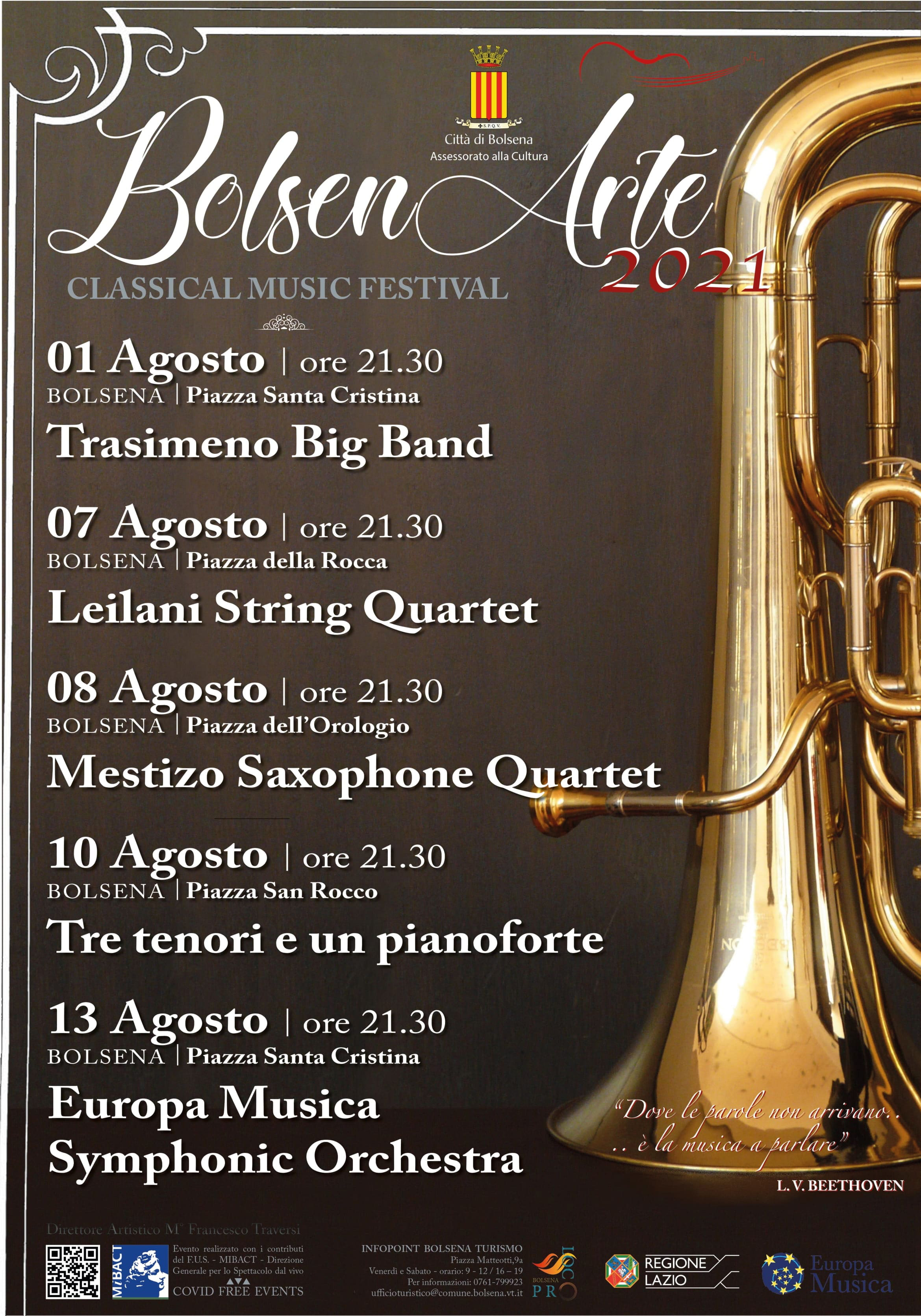 Si aprirà il 1° agosto la seconda edizione di BolsenArte, il festival della musica classica organizzato dall’assessorato alla cultura del Comune di Bolsena, con il contributo del Ministero della Cultura, della Regione Lazio e dell’Associazione Cento Città in Musica, per la direzione artistica del maestro Francesco Traversi (nella foto). Le piazze più belle del centro storico cittadino faranno da cornice ai concerti, a ingresso gratuito nel rispetto delle normative anti-Covid. Per lo spettacolo inaugurale del 1° agosto, alle ore 21.30, in piazza Santa Cristina, salirà sul palco la Trasimeno Big Band, ensemble spumeggiante che si cimenterà nel repertorio classico del grande swing, con citazioni di famosi standard blues e jazz.