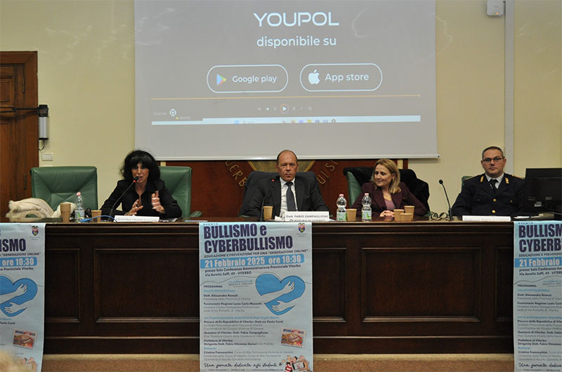 Si è svolto nella mattinata di venerdì 21 febbraio, presso la Sala Conferenze Benedetti dell’Amministrazione Provinciale di Viterbo, l’incontro intitolato “Bullismo e Cyberbullismo – Educazione e prevenzione per una ‘Generazione Online’”, organizzato con l’obiettivo di sensibilizzare studenti, famiglie e istituzioni scolastiche sui pericoli legati al bullismo e al cyberbullismo, promuovendo al contempo strategie di educazione e prevenzione.