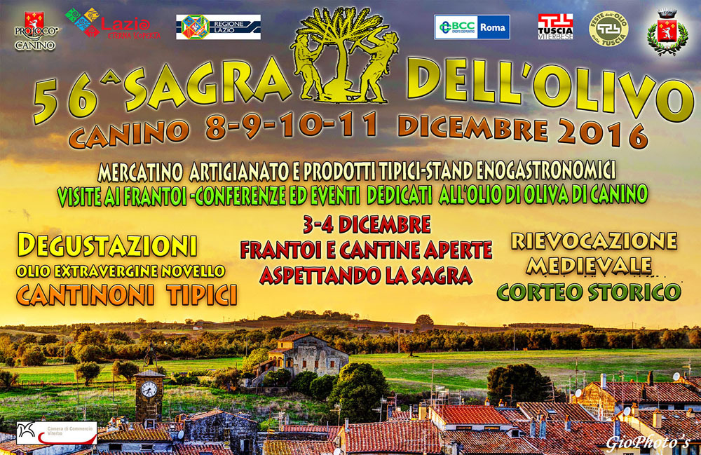 E’ sicuramente una delle feste enogastronomiche più longeve della provincia di Viterbo, la Sagra dell’Olivo di Canino si appresta di fatto a celebrare la sua cinquantaseiesima edizione. Dall’8 all’11 dicembre 2016, con un anteprima dal 2 al 4 caratterizzata dall’apertura di frantoi e cantinoni tipici, la cittadina maremmana si propone al visitatore con una serie di appuntamenti di varia natura – degustazioni, show cooking, rievocazioni storiche, mostre, conferenze, presentazioni di libri, visite guidate, mercatini – finalizzati alla valorizzazione e alla promozione dell’olio extravergine d’oliva Dop per il quale Canino è conosciuta, propulsore dell’economia locale.