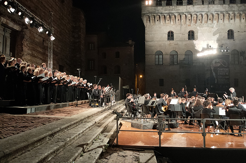 La piazza Grande di Montepulciano, bordata da eleganti merletti di pietra, come il palazzo comunale sovrastato dalla torre merlata e il Duomo, ha accolto domenica scorsa oltre quattrocento spettatori per il concerto di chiusura della 48^ edizione del Cantiere internazionale d’Arte. Sul palco l’Orchestra Poliziana, la Corale Poliziana e il Coro Harmonia Cantata diretti da Daniele Giorgi (direttori dei Cori Judy Diodato e Raffaele Puccianti).