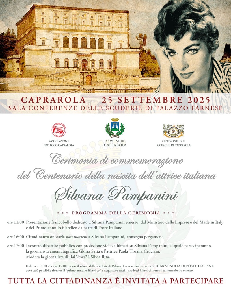 In occasione della cerimonia di presentazione del francobollo dedicato a Silvana Pampanini nel centenario della nascita, in programma domani giovedì 25 settembre, presso la sala Conferenze delle Scuderie di Palazzo Farnese, in Via Regina Margherita, a Caprarola, Poste Italiane attiverà un servizio postale temporaneo con bollo speciale per emissione.