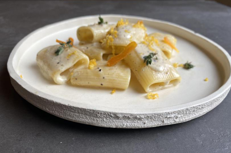 Una carbonara in versione vegetariana dove il guanciale e la sua componente aromatica vengono sostituite dall’utilizzo di diverse spezie, mentre il pecorino cede il posto al tuorlo disidratato e grattugiato. È una vera e propria “inversione di ruoli” l’anima ispiratrice di questa ricetta realizzata dal team di chef, tutto al femminile, di Al Tatto: composta da cremosi paccheri rigati insaporiti da un condimento a base di pepe, timo, ginepro, salvia, aglio e tuorlo disidratato.