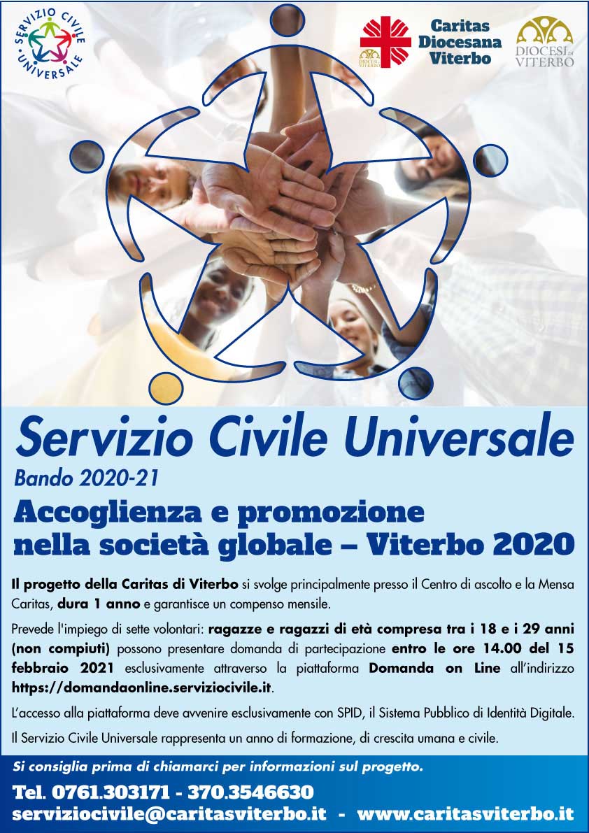 Per i ragazzi e le ragazze interessate l’invito è di chiamare la segreteria Caritas al 0761.303171 – 370.3546630 per avere maggiori informazioni e visitare il sito www.caritasviterbo.it.