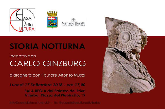 La Casa della Cultura di Viterbo, con la collaborazione del Liceo Mariano Buratti e il patrocinio del Comune di Viterbo ospiterà lunedi 17 settembre alle ore 17.00 a Palazzo dei Priori a Viterbo lo storico, filosofo, antropologo Carlo Ginzburg. L’occasione per questo incontro è la riedizione, per merito dell’editore Adelphi, di un libro che, al suo apparire nel 1989, suscitò subito, vuoi per il tema trattato, vuoi per i raffinati e spregiudicati metodi di indagine utilizzati dallo studioso, una vasta risonanza accompagnata da entusiasmi, critiche, e varie inquietudini. Si tratta di “Storia notturna. Una decifrazione del sabba”. Tornando a discutere intorno a questo libro per certi aspetti unico nel panorama della storiografia contemporanea (difficile definirlo soltanto come un libro di storia), Ginzburg ci parlerà di streghe ed eretici, di sciamani siberiani, di complotti, di vittime e dei loro carnefici, trasportandoci nel sottosuolo della nostra stessa cultura europeo-occidentale, alla ricerca di fondamenti non sempre rassicuranti. Dialogherà con Carlo Ginzburg il dott. Alfonso Musci, giovane e acuto studioso di cose storiche e filosofiche