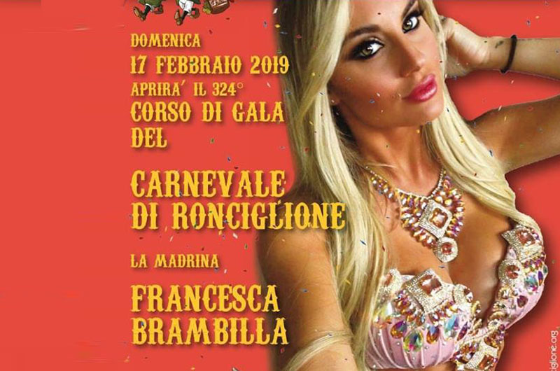 Il Carnevale Storico di Ronciglione apre con il 324° Grandioso Corso di Gala che avrà una madrina d’eccezione Francesca Brambilla direttamente da “Avanti un’altro” – Domenica 17 Febbraio 2019 dalle ore 16:00 … Quest’anno grandi novità …I celebri Grandiosi Corsi di Gala raccontano la passione di chi è capace di lasciarsi tutto alle spalle: lavoro, sport, famiglia e per lanciarsi in uno sfrenato divertimento che non ha età, mostrando tutta la sua vitalità interiore capace di far immergere nel divertimento puro e staccare dal quotidiano.