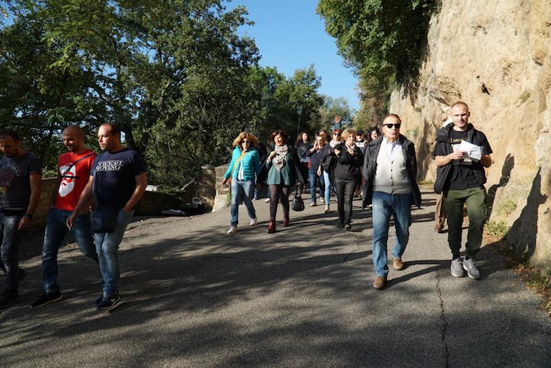 Il percorso odierno si snoda lungo il “sentiero delle lavandaie” da “Mercatello” agli orti di “Calleno”, veniva percorso un tempo dalle donne del paese di Bagnoregio per portare i panni a lavare al fontanile. Emiliano Macchioni apre con il programma del giorno e legge alcune poesie di Filippo Paparozzi vernacoliere del posto. Il saluto del narratore e attore Marco Rossi con la sua bella interpretazione, sul sentiero delle lavandaie mette la carovana sulla frequenza giusta. Al casolare del Castorino ci attende il poeta Realino Dominici con la sua poesia lo “Straccasomare” in compagnia dell’asina “farfallina” che funge da spalla. Lungo il percorso troviamo il tartufaio Rosario Baccello con il suo “lagotto” di nome Mia, ci spiega quanto sia importante il legame con il cane da tartufi, un legame che dura tutta la vita, e da un tovagliolo a quadri rosso e azzurro tira fuori alcuni tartufi “bianchi dei calanchi” che con il loro profumo ci fanno scoprire un mondo fino allora sconosciuto.