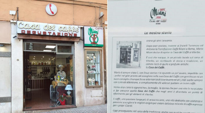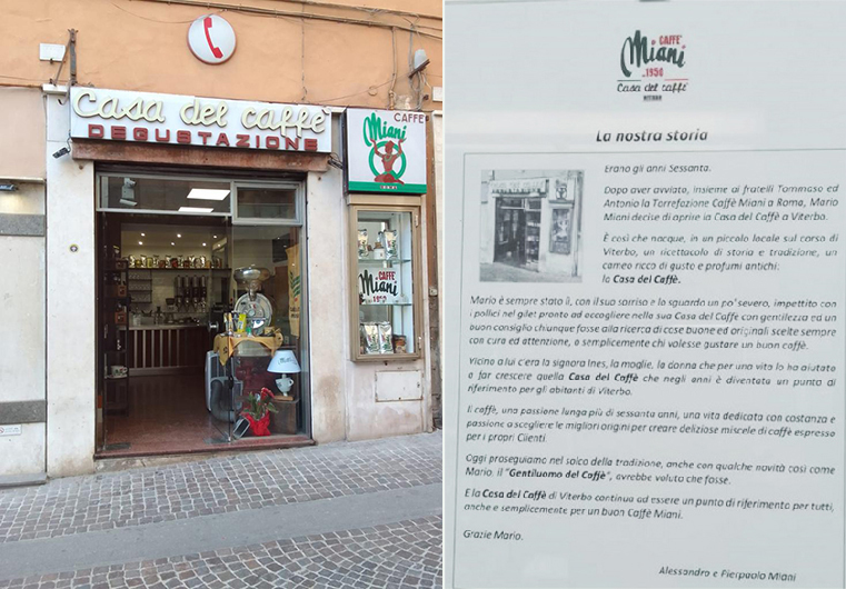 La Casa del Caffè di Viterbo è una parte importante della nostra storia nel mondo del caffè. Mario ed i suoi fratelli Tommaso ed Antonio hanno fondato il Caffè Miani e noi, negli anni novanta, abbiamo proseguito la loro iniziativa. La nostra azienda opera prevalentemente nel settore Ho.Re.Ca. (bar e ristoranti) come gran parte delle torrefazioni italiane, ma quasi tutte le torrefazioni industriali hanno origine dalle “botteghe del caffè” degli anni 60 e 70, e la Casa del Caffè di Viterbo è per noi quella “Bottega” dalla quale proviene la nostra tradizione; lasciamo a Ines di riposarsi dopo 50 anni di ininterrotto lavoro a fianco di Mario.