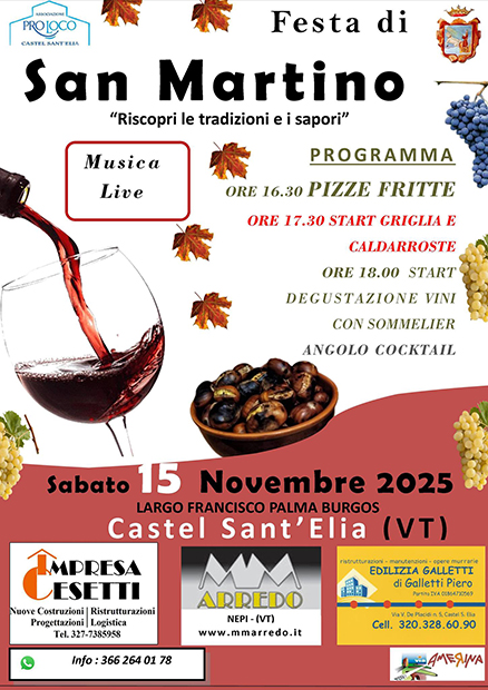 Sabato 15 novembre Castel Sant’Elia rinnova uno degli appuntamenti più attesi dell’autunno: la Festa di San Martino, organizzata dalla Pro Loco con il supporto di volontari, attività e realtà del territorio. Una giornata pensata per valorizzare le tradizioni enogastronomiche locali, creare momenti di incontro e far vivere il paese come luogo di comunità e accoglienza.