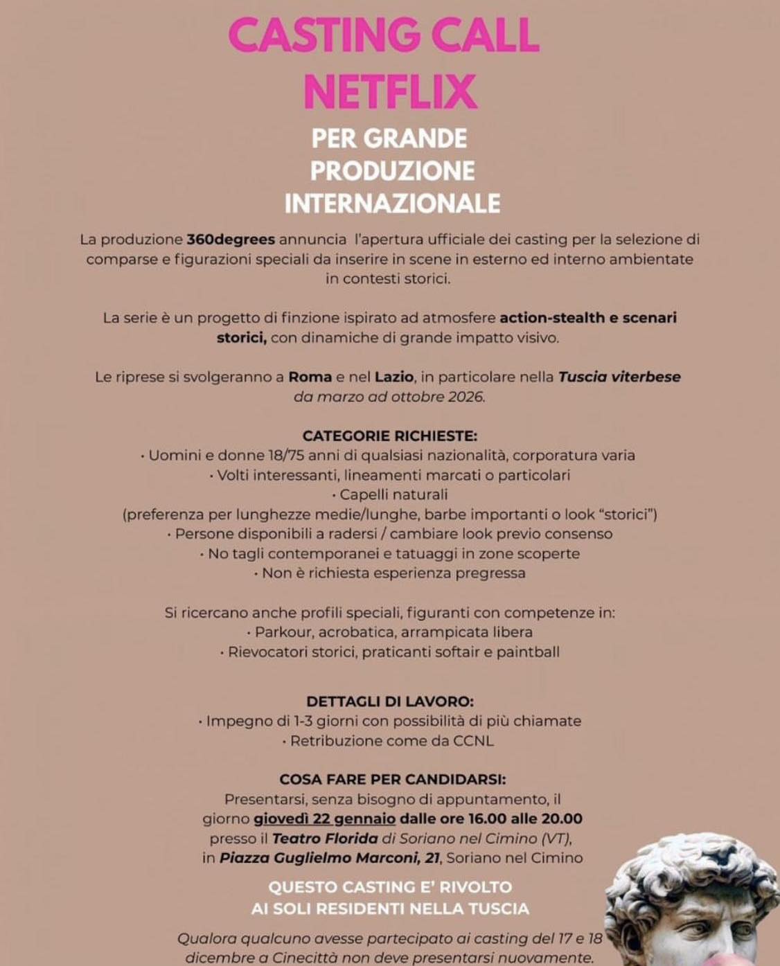 Casting aperto giovedì 22 gennaio al teatro Florida in piazza Guglielmo Marconi, 21 a Soriano nel Cimino, dalle ore 16.00 alle ore 20.00, per una grande produzione internazionale. Selezioni riservate ai residenti della Tuscia per comparse e figurazioni speciali da inserire in scene in esterno e interno ambientate in contesti storici. Le riprese si svolgeranno nella Tuscia viterbese, a Roma e nel restante Lazio. Tutti i requisiti e le indicazioni in grafica.
