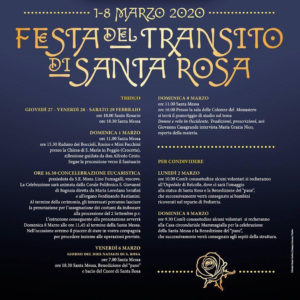Il prossimo 1 marzo si celebrerà il Transito di Santa Rosa (la ricorrenza è il 6 marzo). Per consentire il regolare svolgimento delle iniziative previste, sono stati predisposti una serie di provvedimenti riguardanti la sosta e il traffico veicolare. Pertanto, domenica 1 marzo, dalle ore 13,30 fino a cessata necessità, in largo Facchini di Santa Rosa, in via Santa Rosa, piazza della Crocetta e via Mazzini (tratto da piazza della Crocetta a Corso Italia) sarà istituito il divieto di sosta con rimozione.