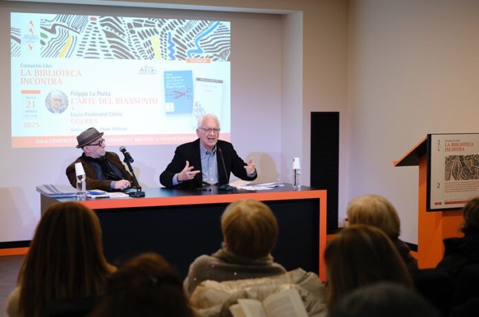 La Porta prende la parola: “Grazie sono davvero felice di essere qui e vedere una sala colma ed inconsueta. Abbiamo pensato di dividere l’incontro in due parti, vi parlo di Cèline che amo con rabbia, con sofferenza, rispetto a tutti gli altri autori del modernismo letterario, a me appare inerme si offre senza difesa colpisce di lui la sua assoluta visceralità, lui ha denunciato più di ogni altro la menzogna il formalismo della borghesia. L’aspra verità è l’anima del suo genere romanzesco,l’insuperabilità del suo racconto, le costanti  dello scrittore, anche il comico grottesco. Negli ultimi anni di vita è caduto in uno oscuramento mentale in cui faceva parola tutto ciò che lui detestava. Una certa psicosi che lo ha ostinato verso la parola ebrei, e lo scrittore La Porta suggerisce al lettore di provare a mettere al posto di ebreo la parola borghese.