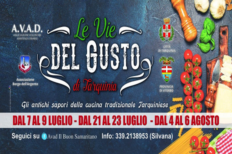 Nell’area Eventi Pineta AVAD di Tarquinia Lido si prospetta una estate all’insegna della Gastronomia Maremmana con le “Cene Parlate” de “Le Vie del Gusto”: eventi gastronomici organizzati dall’Associazione A.V.A.D. e dall’Associazione Borgo dell’Argento con menù tematici dedicati alla promozione delle tradizioni culinarie e dei piatti tipici e storici di Corneto e dell’odierna Città di Tarquinia. Nel corso delle “Cene Parlate” saranno resi noti, dai “Cucinieri” del Borgo Argento, gli ingredienti delle varie pietanze proposte e delle quali saranno spiegate anche le modalità di preparazione oltre ad essere inquadrati nei contesti sociali, legati alla vita contadina, nei quali hanno avuto origine e sono stati creati. Piatti e vivande ideate e consolidate dalla tradizione per far fronte alla quotidiana essenziale necessità del mangiare in stretto legame con il gusto del palato, prodotti legati al territorio e l’amore per la tavola da sempre momento celebrativo per lo stare insieme e fonte di unioni e di amicizie.