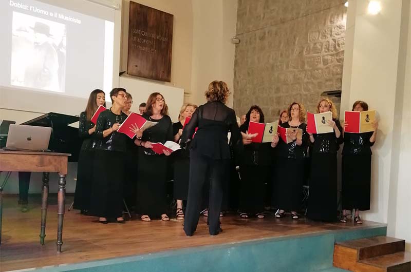 Il Presidente dell’Associazione, Ferdinando Bastianini, ha ripercorso le vicende che hanno permesso di ricevere il materiale epistolare e la ricca documentazione per volere della stessa famiglia del Dobici. L’ interessante excursus storiografico ha avuto, poi, momenti di intervallo musicale con brani bellissimi eseguiti con impeccabile tecnica vocale dalla Corale Polifonica S. Giovanni, diretta da M. Loredana Serafini, che ha plasmato il corredo musicale della manifestazione, voci soliste: Barbara Giannetti e Tina Massantini. Una musica sobria e asciutta, quella del nostro Dobici, ma intensa nelle linee espressive, brani desunti dalla polifonia delle sue ben concepite Messe e dalle sue ispirazioni più intime, come la celebre Ave Maria del Monte Grappa.