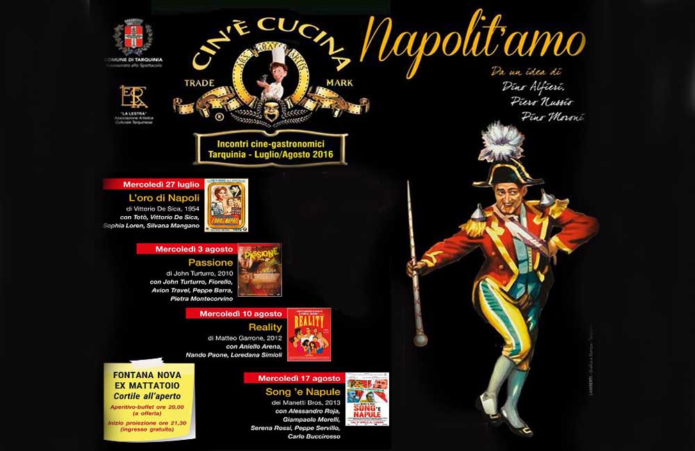 Torna la rassegna cinematografica “Cin’è Cucina, Napolit’amo. Dal 27 luglio al 17 agosto una serie di incontri cine-gastronomici saranno i protagonisti delle serate estive tarquiniesi. Gli spettacoli iniziano alle 21.30 (ingresso libero), preceduti da un aperitivo buffet alle 20 (ad offerta libera), e si tengono presso l’ex Mattatoio di Fontana Nova. La manifestazione è organizzata dall’associazione culturale La Lestra, da un’idea di Pino Moroni, Dino Alfieri, Piero Nussio.