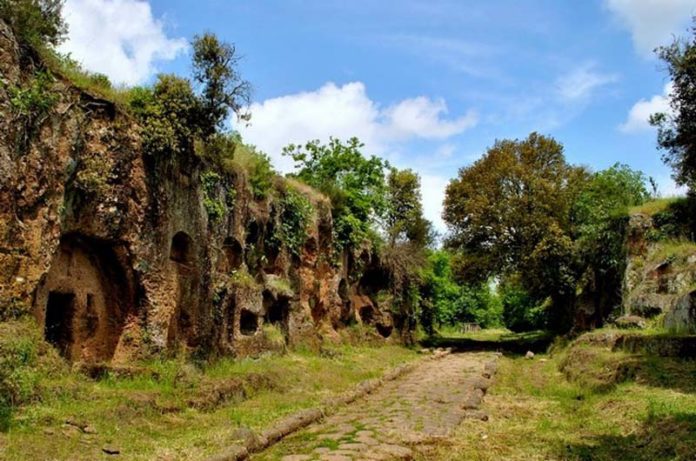 Il perno di questo sentiero di straordinaria bellezza è il complesso del Cavo degli Zucchi: la grande tagliata sulla Via Amerina dove si conserva ottimamente un lungo tratto dell’antico basolato romano, completo in tutte le sue parti. Un vero e proprio cammino sulla storia, in questo caso raccontata direttamente da quanti hanno voluto, in maniera indelebile, rimanere qui per sempre. La località è, infatti, caratterizzata dalla presenza, lungo le pareti della stessa via, di quasi 200 tombe di diverso tipo che accolgono, le une accanto alle altre, sepolture sia a incinerazione che a inumazione, a testimonianza della funzione che l’asse viario ha avuto nei secoli, capace di assorbire e mantenere le memorie storiche dagli abitanti più antichi, i Falisci all’età medioevale.