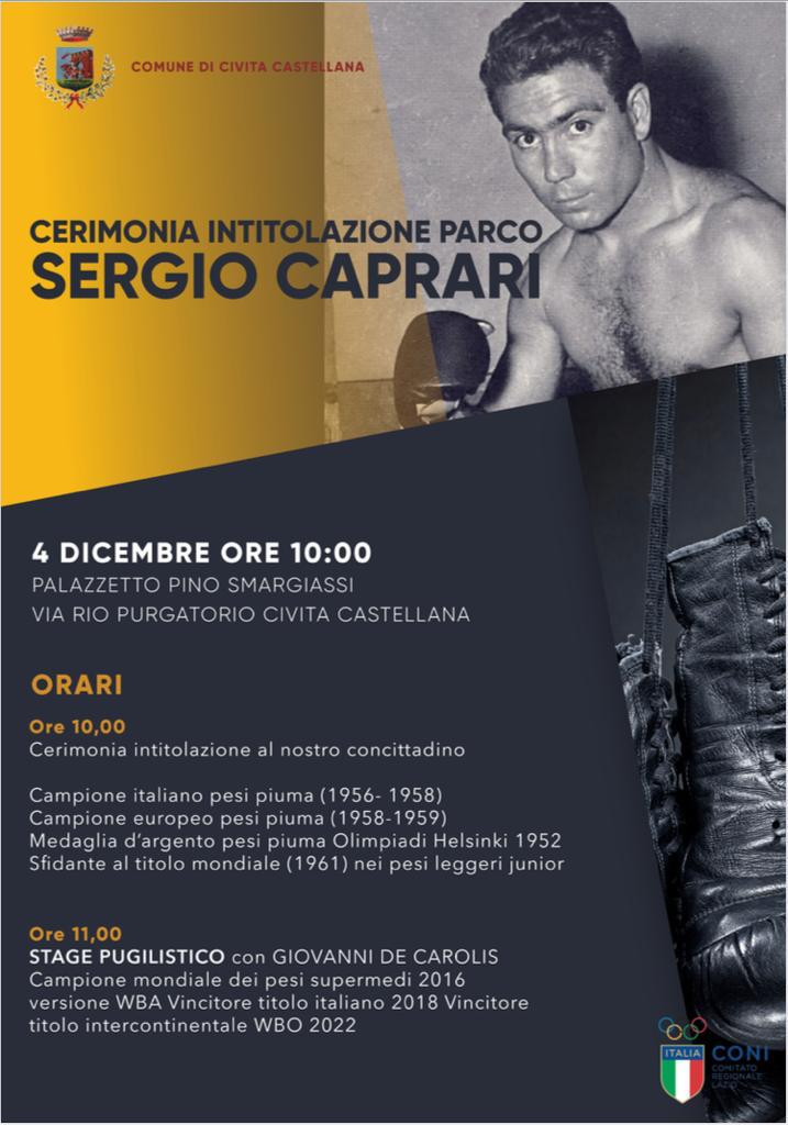 L’intitolazione si terrà il 4 dicembre prossimo, con una cerimonia che avrà inizio alle ore 10.00. A seguire, presso il palazzetto Pino Smargiassi, si terrà uno stage di pugilato con Giovanni De Carolis, campione del mondo dei pesi medi 2016 WBA, campione italiano 2018 e vincitore del titolo intercontinentale 2022. “Abbiamo voluto organizzare una giornata con eventi e celebrazioni in ricordo di Sergio Caprari – aggiunge l’assessore allo sport, Giovanna Fortuna -, a partire dall’intitolazione del parco di via Rio Purgatorio, per onorare e ricordare un campione nato e cresciuto nella nostra città e per promuovere, allo stesso tempo, l’attività sportiva della boxe”.