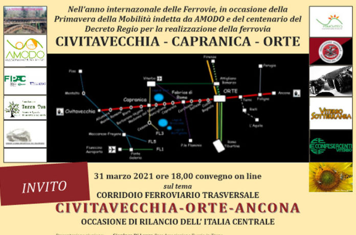 Il  Comitato Civitavecchia Capranica Orte  , come noto, è impegnato da tempo nella sensibilizzazione dell’opinione pubblica e della politica sulla importanza di questa ferrovia per il trasporto merci,  per il riequilibrio del territorio viterbese e lo sviluppo economico di tutto il Centro Italia. Finalizzato a questo tema è stato indetto per il giorno 31 marzo 2021 alle ore 18 una riunione on line.