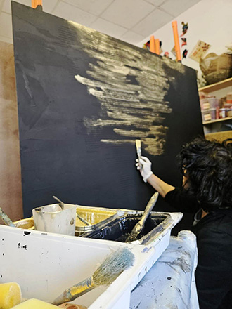 Lidia Scalzo al lavoro su una delle opere del Nobu Hotel