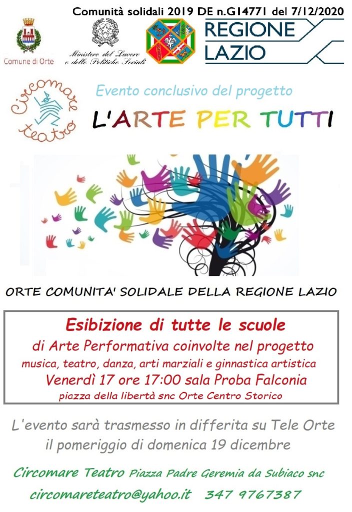 Comunità solidali 2020: si terrà venerdì 17 dicembre alle 17.00 presso la Sala Proba Falconia in piazza della Libertà a Orte, lo spettacolo conclusivo del progetto dell’associazione di volontariato Circomare.