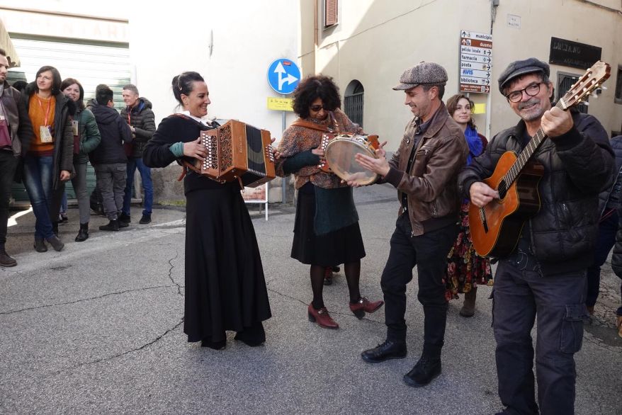 Tutto sembra organizzato a regola d’arte e anche la musica che riempie i vicoli del paese contribuisce a rallegrare il gruppo.