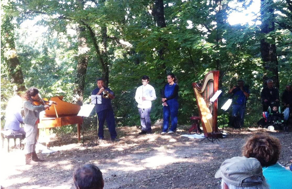 Arrivano da lontano le note di una tromba, poi flauto, arpa e violino che raccontano armonie uniche che si fondono con i profumi del bosco. La dolcezza dei suoni degli strumenti sembra creare una vibrazione armonica con il silenzio e l’ambiente, qui l’acuto di un flauto suona come il cinguettio degli uccelli; l’arpa richiama lo scorrere delle acque, leggero come una barca che si apre la rotta sul lago toccato dalla luce del mattino che avanza davanti ai nostri occhi. La luce aumenta filtrando tra i faggi, mentre il bosco e le note di Vivaldi ci raccontano la primavera. Non si può che amare questi boschi sacri e in questi boschi il silenzio in contrappunto con gli strumenti e questa musica perfetta.