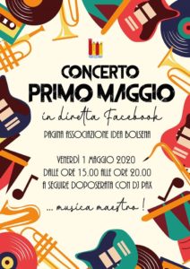 Dalle ore 14:30 del 1 maggio, basterà collegarsi sulla pagina facebook dell’Associazione Idea Bolsena (https://www.facebook.com/assgiovanilebolsenese/) e così il salotto di casa si trasformerà in un’ampia piazza dove si potrà assistere a un grande concerto però sarà anche balera e discoteca… per tutti i gusti!