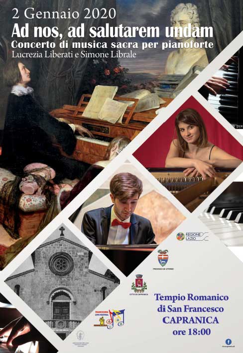 Nell’ambito della terza edizione della rassegna Francigena Live Festival, giovedì 2 gennaio dalle ore 18.00, presso il suggestivo Tempio Romanico di San Francesco, situato nel centro storico di Capranica, concerto di musica sacra per pianoforte “Ad nos, ad salutarem undam” con Lucrezia Liberati e Simone Librale.