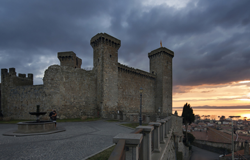 Italy, Bolsena - December 2017. View of the castle Rocca Monaldeschi della Cervara in Bolsena at sunset. On the right side in background the lake.