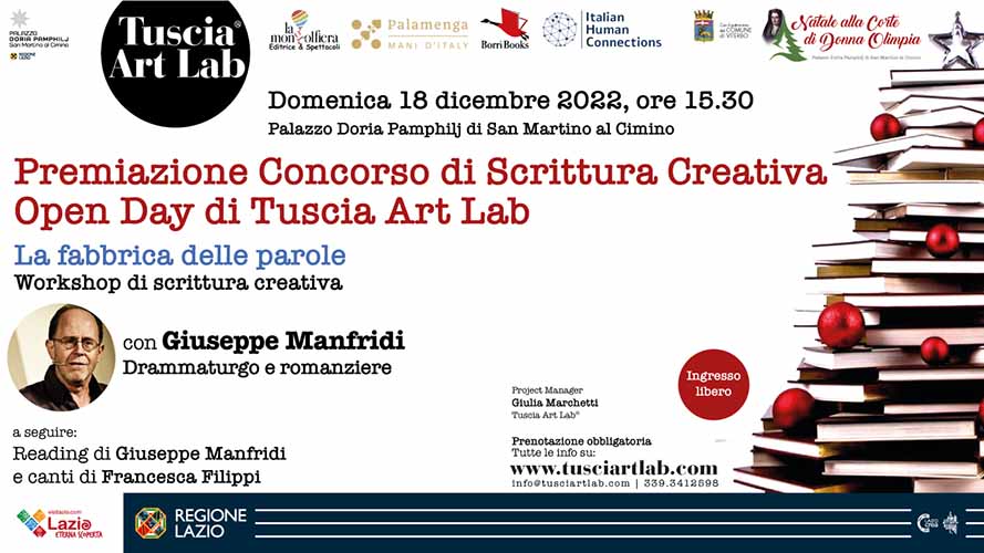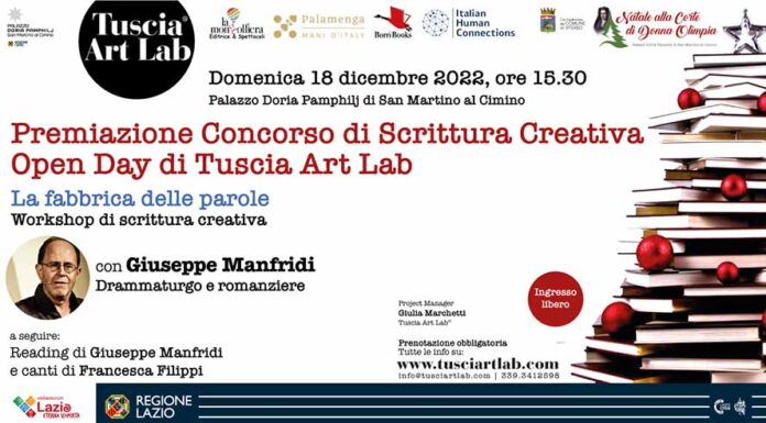 Domenica 18 dicembre alle ore 15:30, presso il Palazzo Doria Pamphilj di San Martino al Cimino (VT), si terrà l’Open Day di Tuscia Art Lab e la premiazione dei migliori racconti brevi di Natale nell’ambito del concorso di scrittura creativa patrocinato dal Comune di Viterbo. L’evento sarà accompagnato da reading e intermezzi cantati di Francesca Filippi.